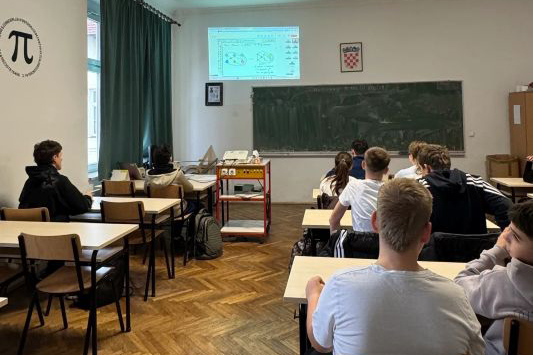 Učenici 7. e slušali su predavanje izv. prof. dr. sc. Mate Puljiza „Nemogući graf” koji pokušava spojiti tri grada sa strujom, vodom i plinom, a da se spojnice ne presijecaju. Učenici su saznali za poznatu Eulerovu formulu koja povezuje vrhove, bridove i strane poliedra. Mato je profesoru Mati ponudio svoje rješenje problema.