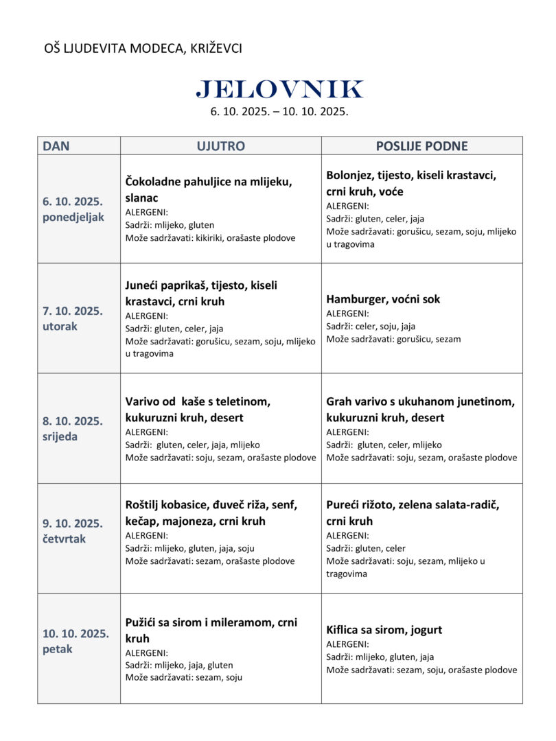 Jelovnici 13. – 17. listopada 2025. 6. – 10. listopada 2025. 29. rujna – 3. listopada 2025. 22. – 26. rujna 2025. 15. – 19. rujna 2025. 8. – 12. rujna 2025.