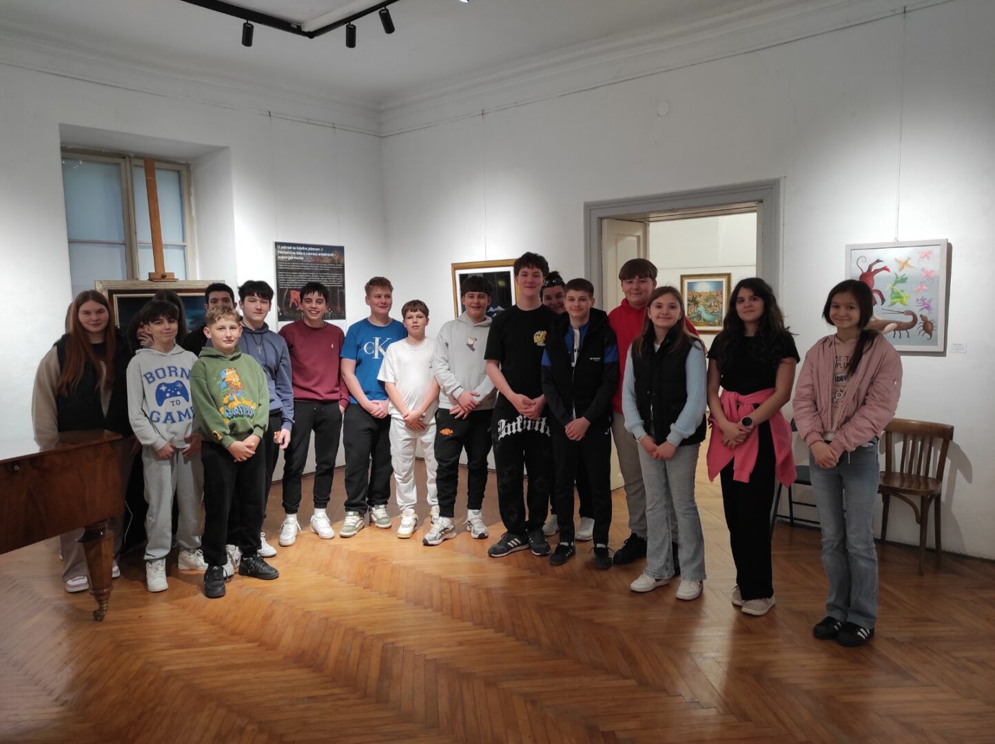 Učenici 7. e i njihova razrednica Gordana Podravec posjetili su 23. 3. Likovnu galeriju gradskog muzeja i izložbu „U potrazi za bijelim jelenom – fantastična bića u naivnoj umjetnosti”. Viši kustos Ozren Blagec objasnio je kako su životinje neiscrpna inspiracija umjetnicima – one stvarne, ali i one koje žive u legendama, mitovima i usmenim predajama. Predstavnici hrvatske naivne umjetnosti – Ivan Generalić, Ivan Večenaj, Franjo Klepetan, Đurđica Balog i ostali – predstavili su svoja fantastična bića pozitivne simbolike pobjede dobra nad zlom, vjernosti, vjere, odanosti…